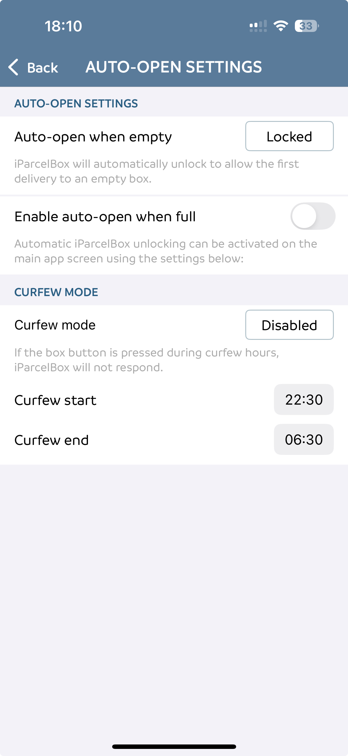 Once configured, your iParcelBox will automatically enter Curfew Mode each day at your chosen time, and switch back to normal operation when the curfew period ends.